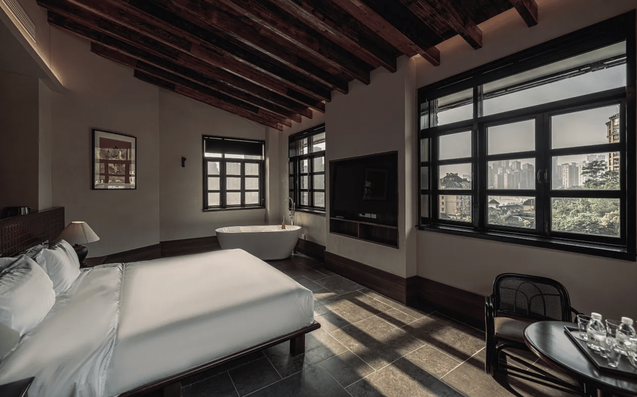 - Bai Nian Xia Hao Fuguang River-View Double Bed Room : King bed with spectacular Yangtze views