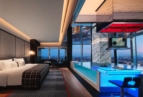 With a service rating of 9.8/10, SEYA Panoramic excels in hospitality. Guests particularly appreciate several features: exceptional room quality and cleanliness (9.7/10 rating), premium amenities (9.6/10), and central location (9.7/10). The hotel is regularly described as “picture-perfect” by guests. The afternoon tea space on the 58th floor has become a major Instagram attraction. The Storm Spa, though undergoing improvements according to some reviews, remains a distinctive asset with high-end relaxation facilities. The staff is recognized for professionalism and responsiveness (some clients mention requests are resolved within 5 minutes). Children aged 0-14 can stay free without an extra bed.