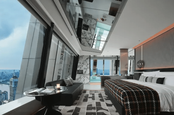 SEYA Panoramic offers 11 room types, each designed to provide a high-end residential experience. The Floating Light Tower – River View Grand King Room (52 m², floors 50-51) features spacious accommodations with a 2.7-meter king-size bed and spectacular river views. The Twilight Tower and Lapis Tower (45 m², floors 50-52 and 59) combine elegance and intimacy with large private bathtubs and panoramic vistas. The Fantasy Tower – Deluxe Suite (50 m², floor 59) represents the pinnacle of luxury with its stunning 10-meter panoramic window and oversized bathtub. All rooms feature air conditioning, free Wi-Fi, refrigerator, private bathroom, and premium amenities. Services include a private pool, Storm Spa (wellness center), free gym, complimentary parking, on-site laundry service, 58th-floor café with exceptional views, and 24/7 front desk. The hotel staff speaks English and Mandarin Chinese.