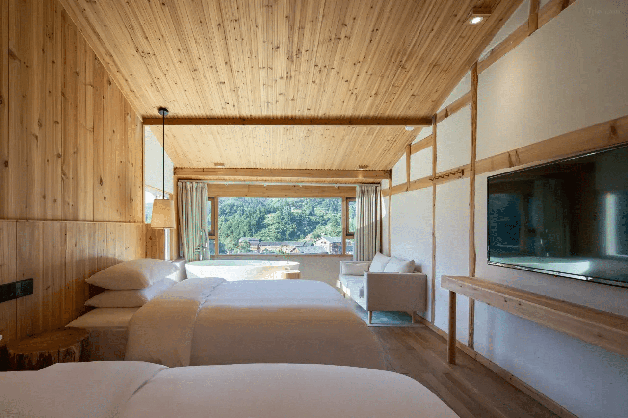 The hotel offers a variety of modern and well-equipped rooms and suites, many with stunning views of the surrounding Dong village. Options include Ping’an Rooms with panoramic bathtubs and 180° village views, Leisure Dong Village View Twin Rooms, and Happy Rooms with balconies and private hot springs. Rooms are equipped with Dyson hairdryers and smart toilets, as well as free Wi-Fi.