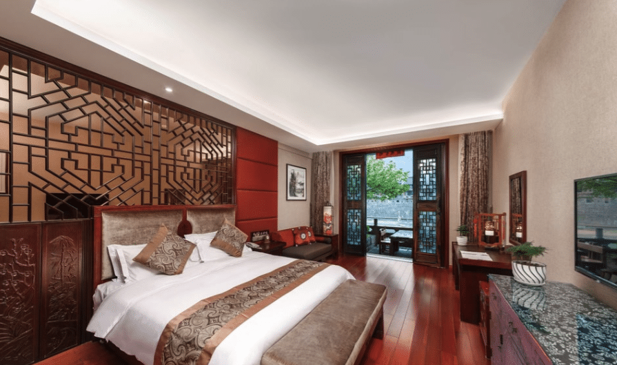 The hotel offers several categories of rooms, from simple doubles to more spacious family rooms, some with a private balcony overlooking the river. Interiors are decorated in a traditional Chinese style, with wooden furniture, carved details and warm colours, and all rooms come with air‑conditioning, private bathroom, TV and Wi‑Fi, providing comfortable yet authentic accommodation for a night or two in Fenghuang. Guests can choose between quieter courtyard rooms or livelier river‑view rooms that immerse you in the atmosphere of the old town, especially in the evening.