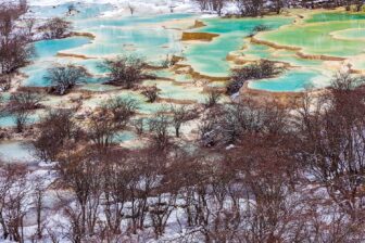 Drive to Huanglong (2 hours). Discovery of Huanglong National Park, composed of impressive karst formations. Surface calcification is the main landscape of the Huanglong Valley, with thousands of pools and calcified banks resembling a golden dragon flying out of the forest. Enclosing dikes form various pools; snowmelt flows along the calcified tiers like terraced fields or fish scales. The water colors shift depending on the sediment, trees, and mountains, appearing yellow, green, light blue, azure, etc. Ascend by cable car, followed by a 50-minute walk to arrive at the Five-Colored Lake at 3,550 meters altitude. Then, allow about 2.5 hours of normal walking through a small but sumptuous valley with its terraced limestone pools to tour the area and descend to the bus without the cable car, in order to admire the landscape. Transfer to Huanglong-Jiuzhai Station, departure by high-speed train C5768 (17:59–19:52) to Chengdu. Arrival at Chengdu East Station, greeting by your driver, and transfer to the hotel. Overnight: Wenjun Courtyard.