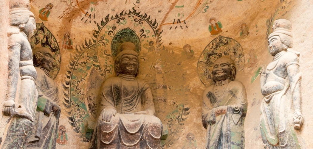 Binglingsi presents a vast collection of statues, engravings and paintings made on the cliffs and in Grottoes. Their difficult access saved them from the various waves of destruction of monuments and looting. It is accessed by boat through beautiful loess landscapes and cut-off mountains representative of the Yellow River Basin. Depending on the season, the river’s water changes from pale yellow to intense copper yellow (in autumn)Their construction began during the Wei dynasty from the north to the 5th century and continued under the following dynasties, many works were added in the 16th century. The oldest engravings are one of the first Buddhist monuments in China. One of the centerpieces is the sitting Buddha dating from the Tang and the reclining Buddha in a small troglodyte temple. many small niches contain refined works more or less well