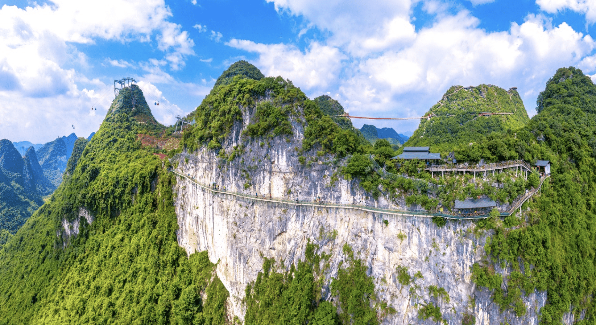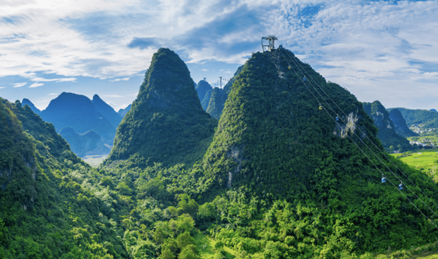 Cable car crossing karst mountain peaks.