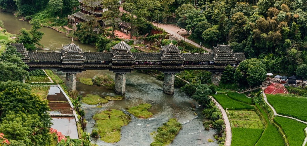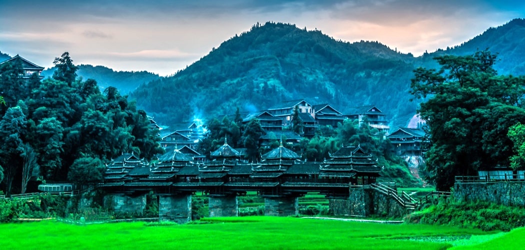The beautiful Chengyang Dong Village, bordered by the Lingxi River, is home to one of Dong’s most impressive wind and rain bridges (Yongji Bridge), now a historic monument. According to Chinese myth, it was built in the early twentieth century, in honor of a Dragon who would have saved a woman fallen into the river by wanting to cross. The Dong architecture of the village is remarkable.The area around Chengyang Village is made up of a string of small villages, where life seems to have not changed for several decades, even though here and there some signs of modernity are appearing.From the top of the hill bordering the village of Chengyang, you can enjoy a superb panorama of the villages around Chengyang, its river and its rice fields.Every afternoon, the people of Chengyang are the actors of a small show of songs and dances, telling legends of their minority. An unpretentious and good-natured show.